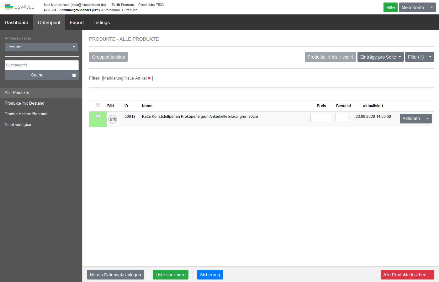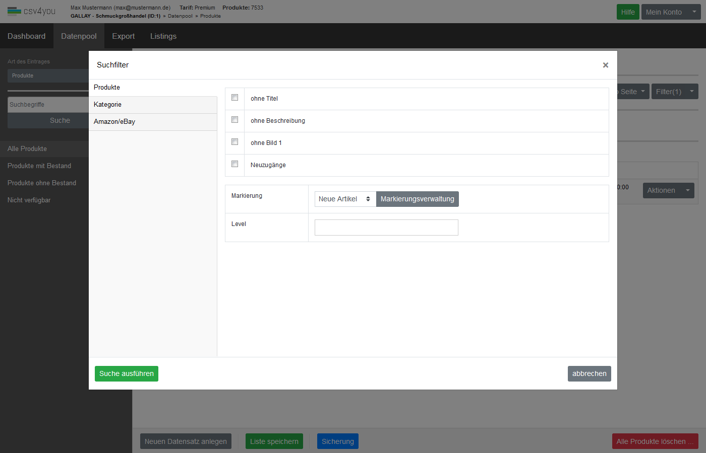 Eine Suche nach Markierungen ist in den Bereichen Datenpool->Produkte und Listings möglich. Desweiteren können Sie diese auch beim Exportprofil mit dem Filter Filter - SQL Abfrage auswerten.