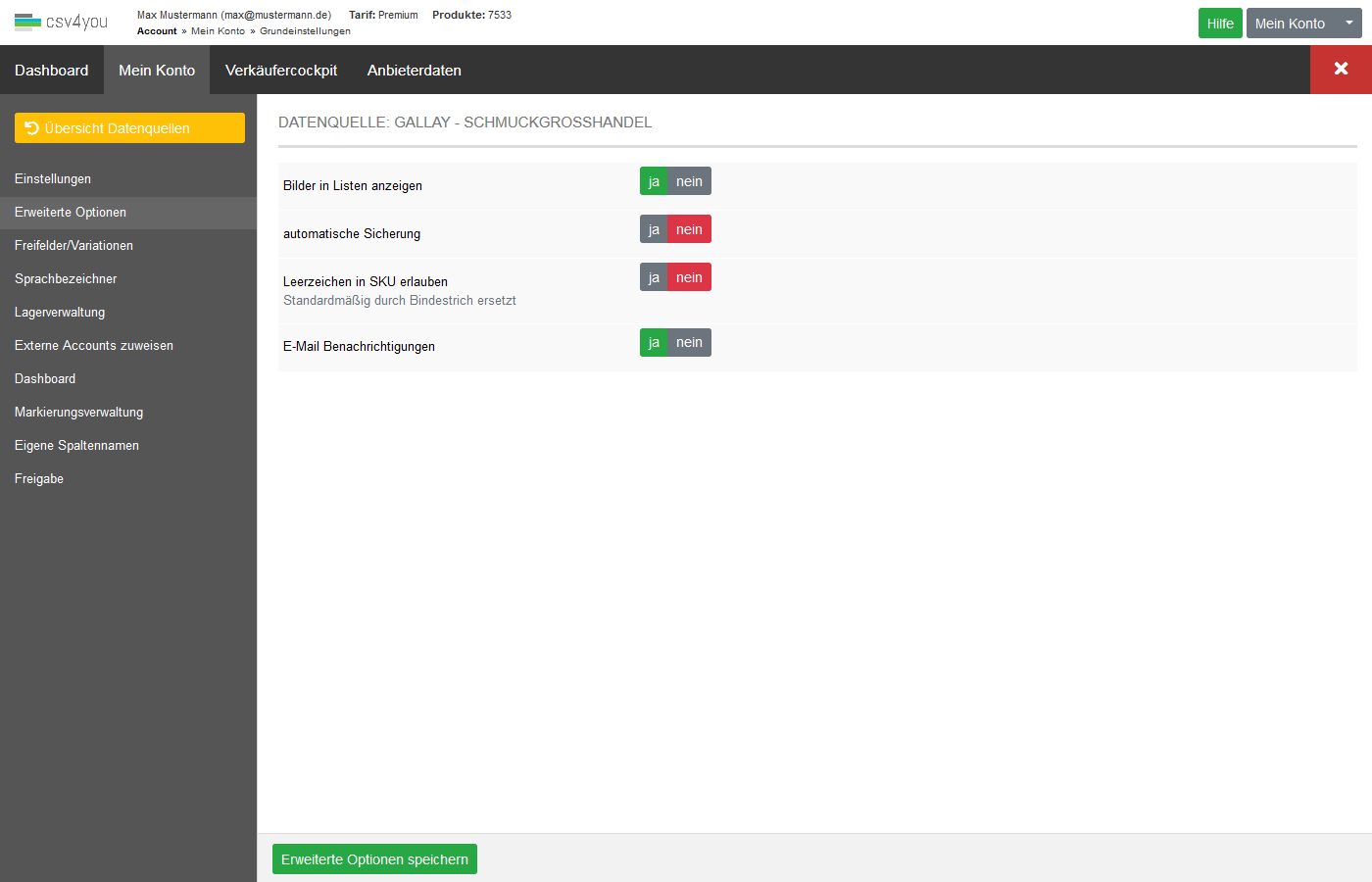 Im Auswahlmenü oben rechts kann die jeweilige Datenquelle, mit der Sie gerade arbeiten möchten, aktiviert werden (Menü ist nur sichtbar, wenn mindestens 2 Datenquellen hinterlegt sind und Sie sich nicht unter 'Mein Konto' befinden). Jede Datenquelle wiederum kann mit unterschiedlichen Exportprofilen, Cronjobs und Vorlagen etc. umgehen. Mit einen Klick auf Bearbeiten kommen Sie zu den Einstellungen für die jeweilige Datenquelle.