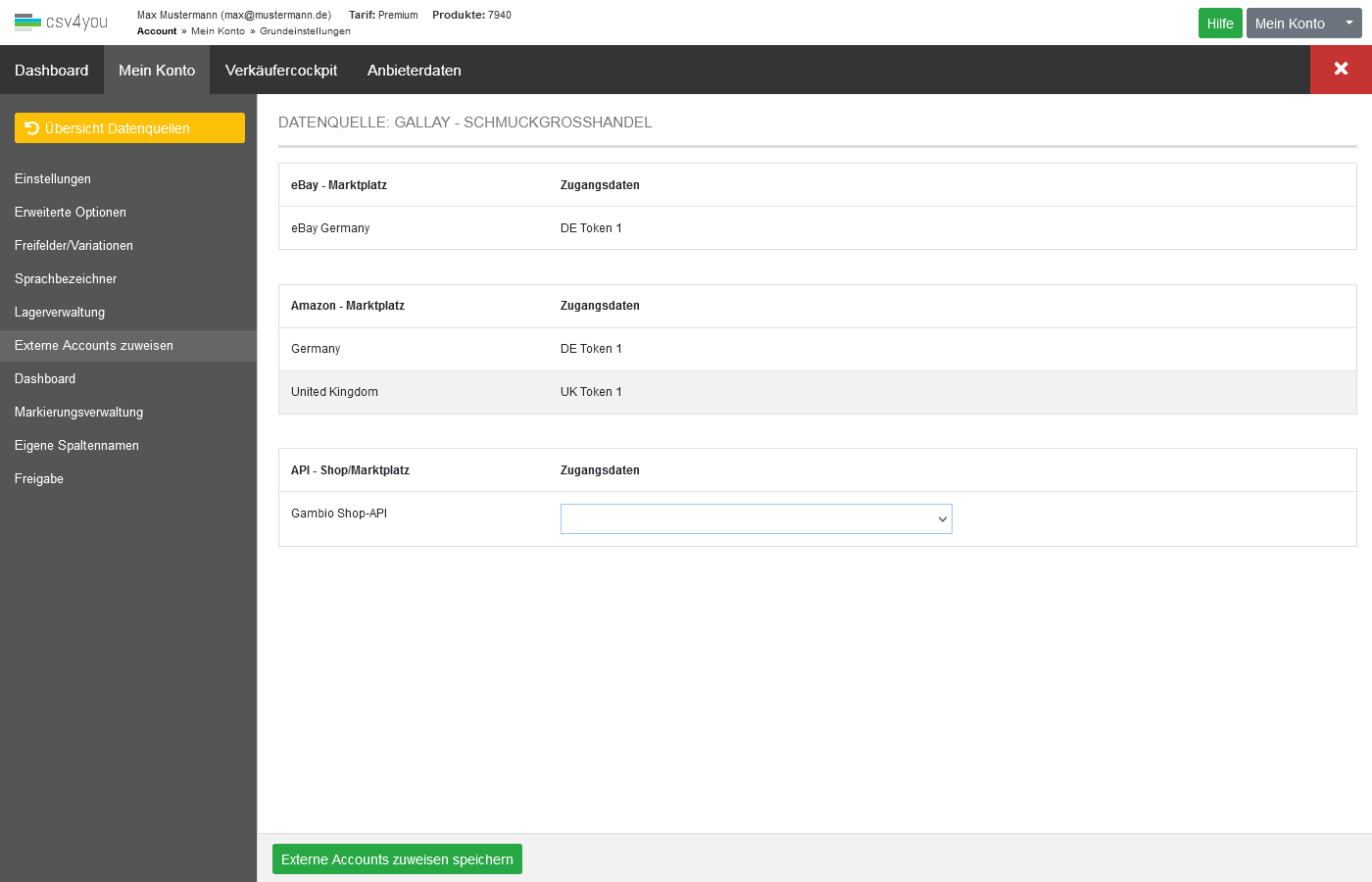Falls Sie mehrere eBay-, Amazon- oder API-Konten angelegt haben, weisen Sie Ihrer Datenquelle hier das passende Konto zu.