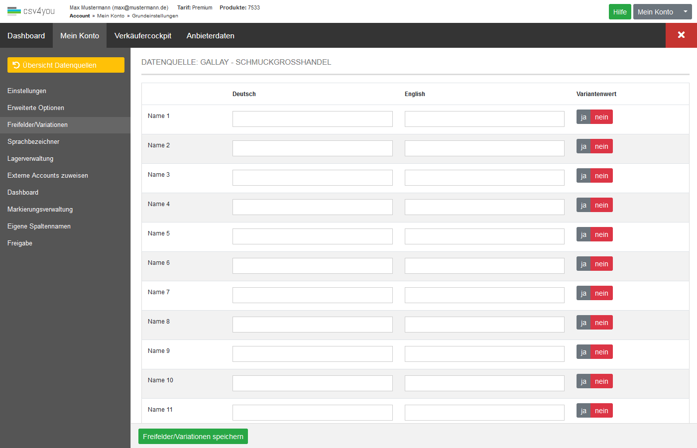 Definieren Sie beliebige Freifelder/Variationen und weisen Sie diese beim Importieren Ihrer Daten den entsprechenden Spalten zu. In den Exportprofilen stehen die Inhalte der Freifelder über folgende Platzhalter zur Verfügung: