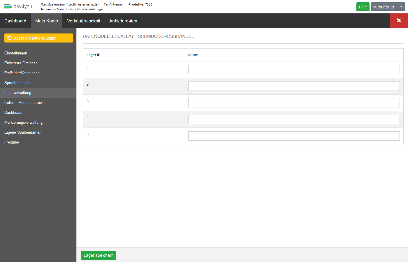 Mit der Lagerverwaltung können Sie die Bestände von unterschiedlichen Lieferanten in einer Datenquelle verwalten. Geben Sie beim Import die Lager-ID mit an und es werden nur die Bestände des jeweilgen Lagers bearbeitet.