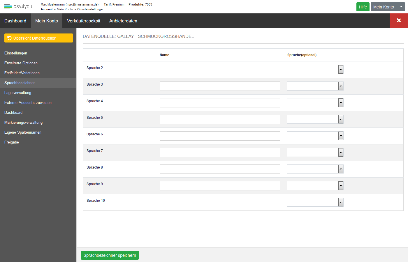 Um weitere Sprachen freizuschalten, müssen Sie eigene Bezeichner vergeben (z.B. Englisch). Nur dann werden die jeweiligen Sprachfelder in den Produkten auch sichtbar.