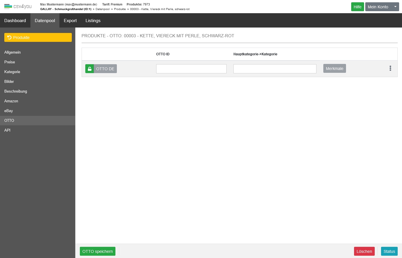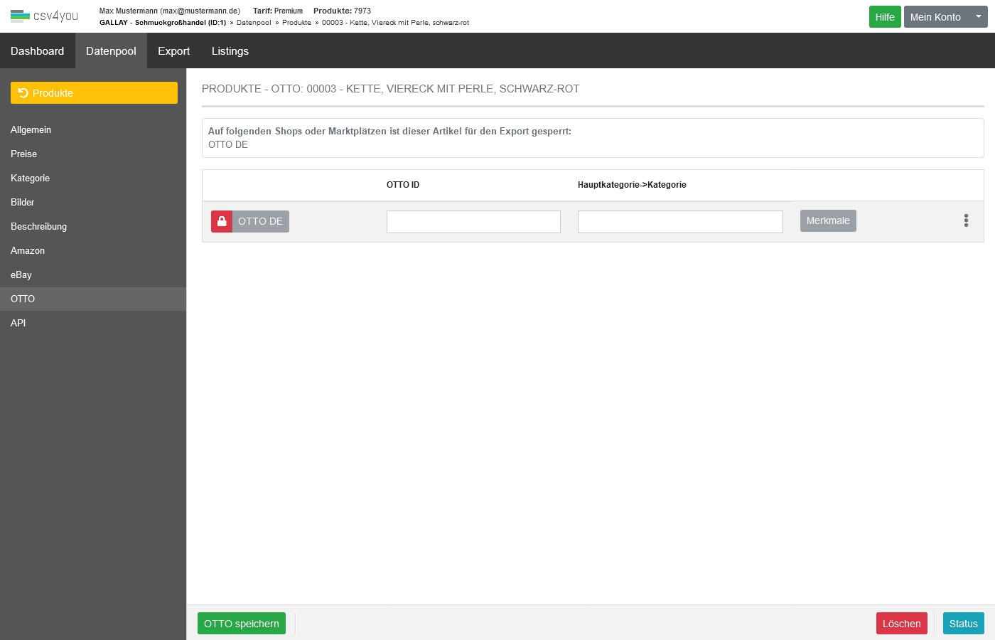 Sie können im Abschnitt 'OTTO' der Einstellungen des Produktes angeben, ob ein Produkt für den Export gesperrt werden soll. Diese Produkte werden dann bei der Übertragung zu OTTO nicht übermittelt.
