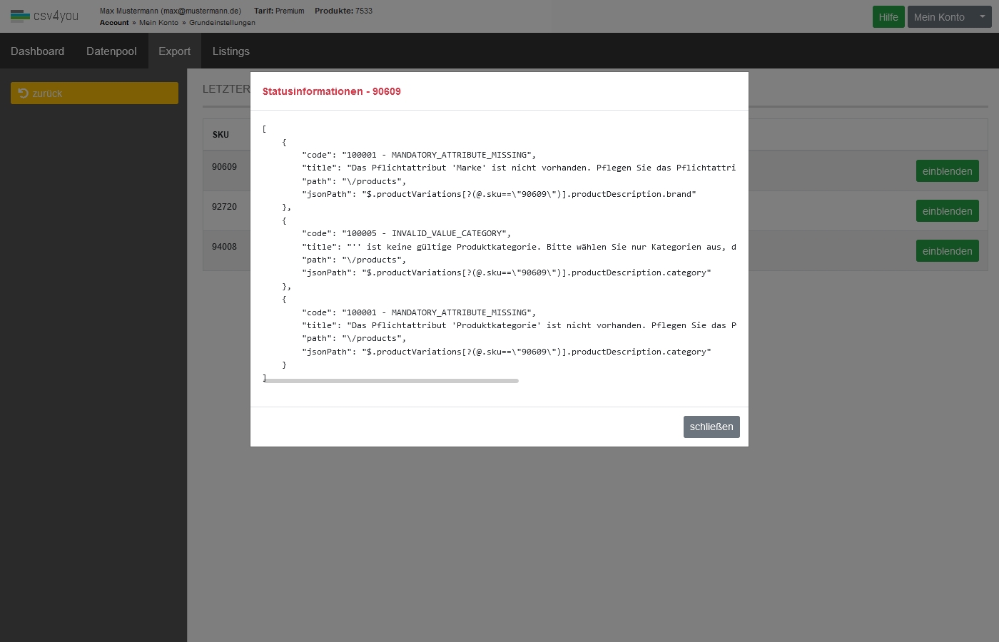 Mit einem Klick auf den Button 'Letzter Statusbericht' kommen Sie zu den Responsedaten des letzten Exportes zu Otto. Hier werden Ihnen alle fehlenden oder falschen Daten angezeigt.