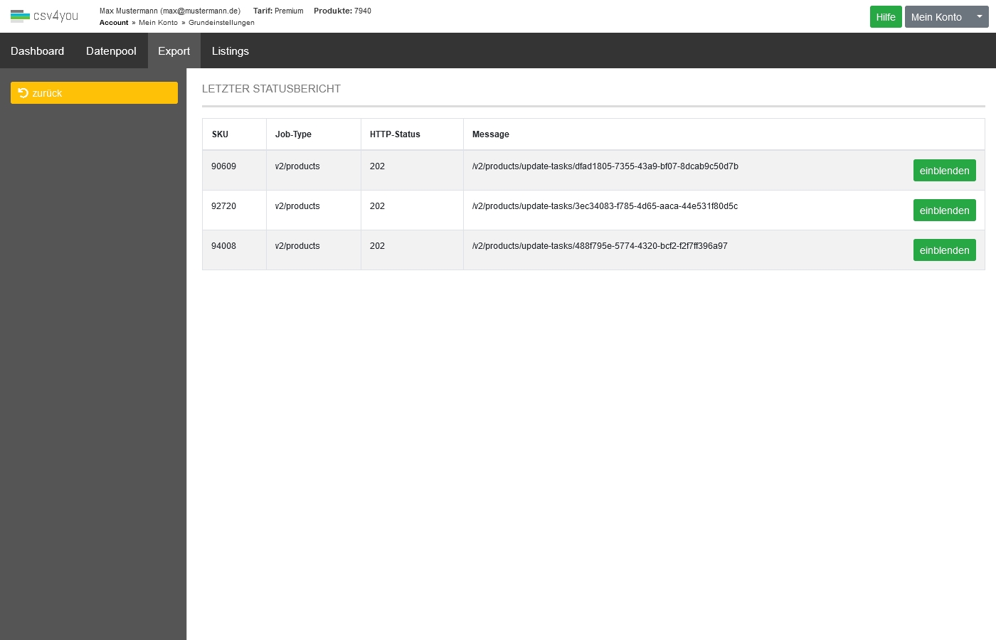 Nach dem Export einer Produktneuanlage schauen Sie sich die Ihnen angebotenen Statusberichte an. In diesen finden Sie Informationen, ob die Produkte übertragen und angelegt wurden. Wenn das erledigt ist, sollten Sie Ihre aktuellen Shop-Daten in unser System zurücklesen. Das erfolgt im Bereich Listings und der Auswahl des jeweiligen Shops. Sie können dafür auch einen Cronjob benutzen, den Sie unter den jeweiligen Verbindungseinstellungen Ihres Systems mit CSV4YOU finden.