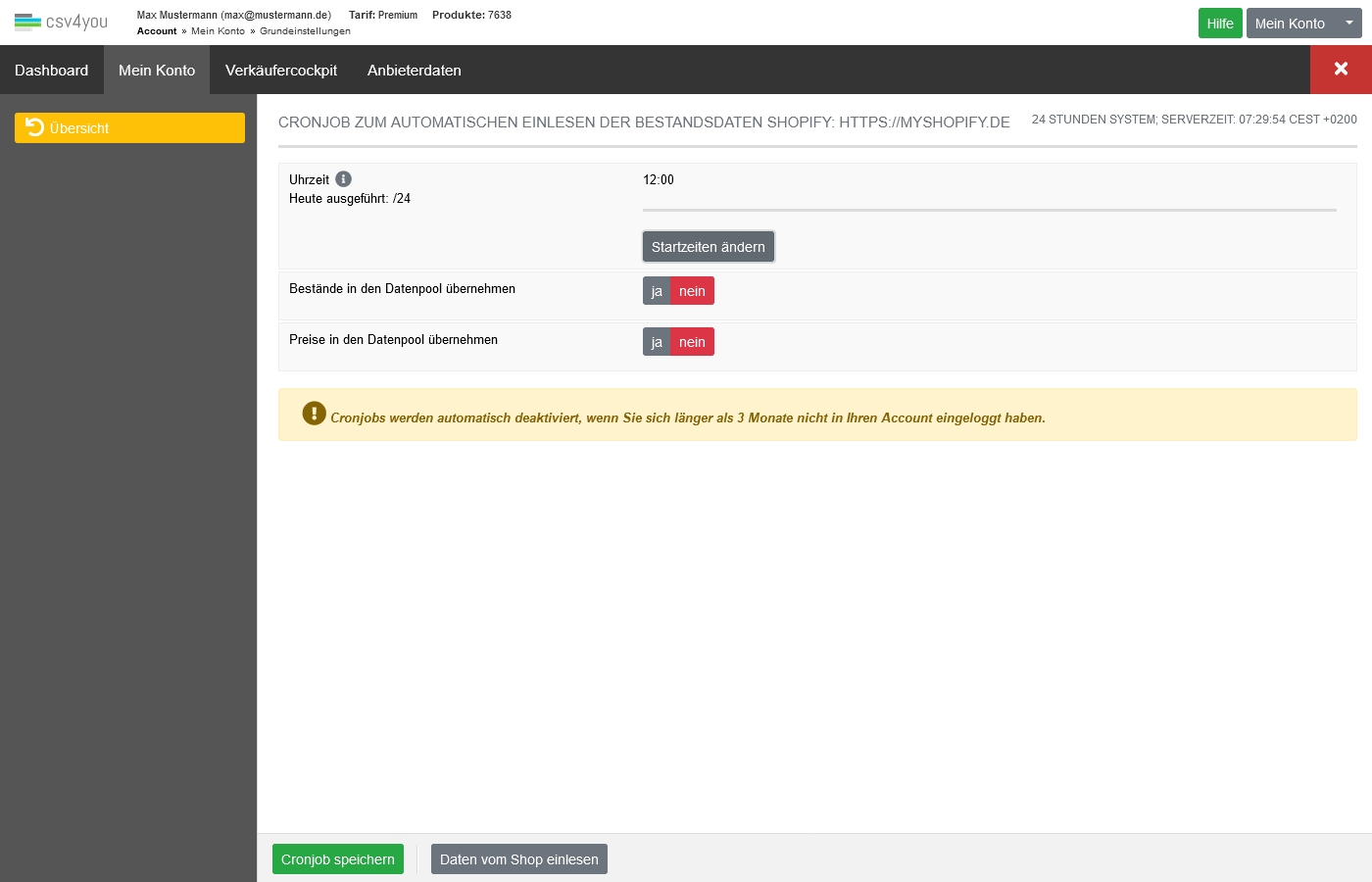 CSV4YOU muss immer den aktuellen Stand Ihrer Shopify-Listings kennen. Dafür müssen Ihre Shop-Daten in unser System zurückgelesen werden. Dieser Vorgang dient dem Abgleich von CSV4YOU mit Ihrem System. Es werden immer die API-ID sowie Preis und Bestand benötigt. Sie können das Zurücklesen manuell durchführen oder per Cronjob erledigen lassen.