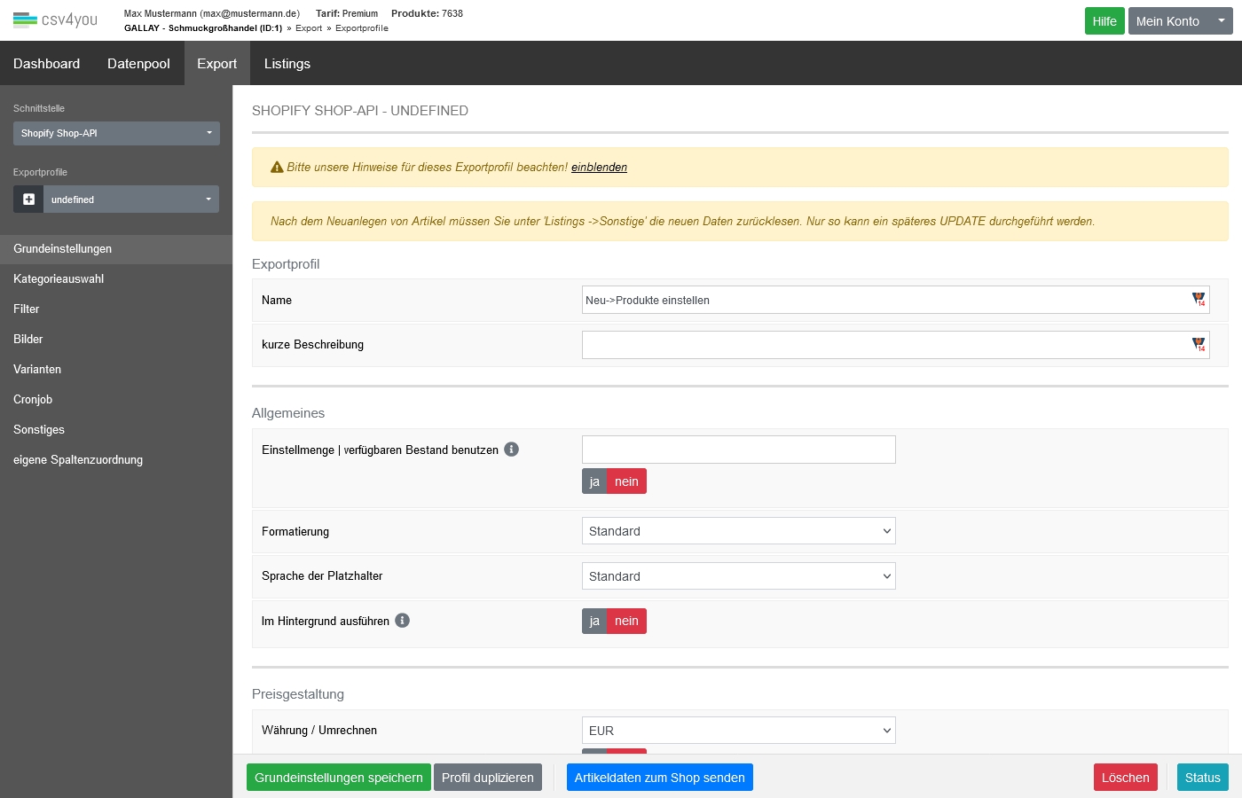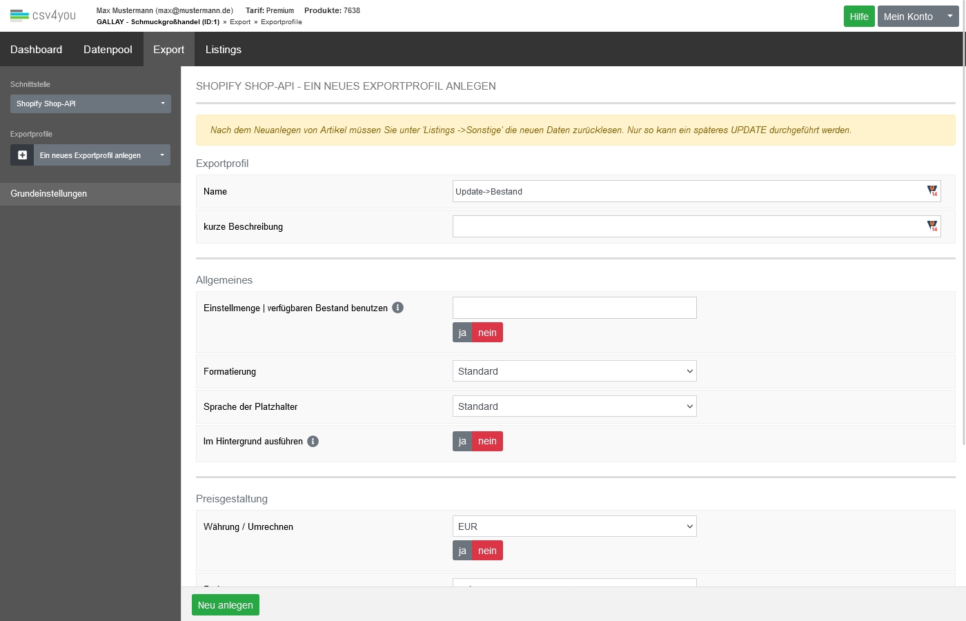 Exportprofil Neuanlage einrichten
