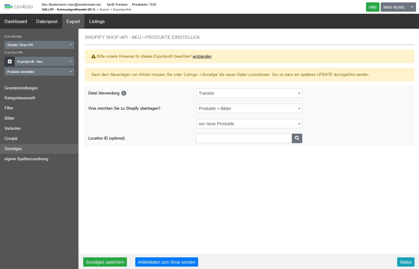 Ein Zurücklesen auf der Seite 'Listings->Sonstige' mit der Schaltfläche 'Daten vom Shop einlesen' schreibt nur die Daten für die gerade benutzte Datenquelle. Im Hintergrund werden jedoch ALLE Listings Ihres Shopify-Shops zurückgegeben und ausgewertet.