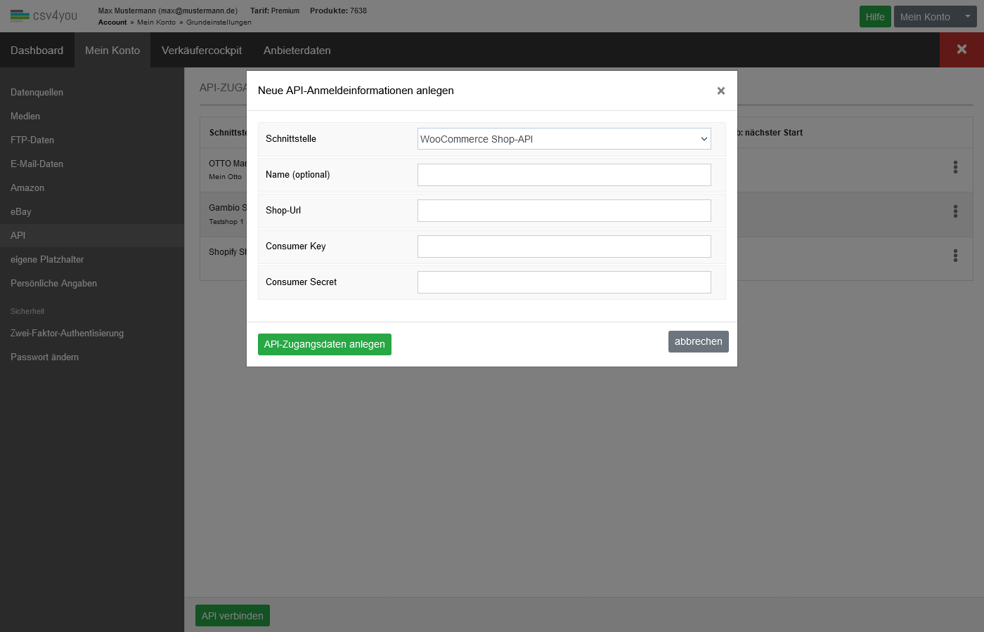 Hinterlegen Sie unter 'Mein Konto->Grundeinstellungen->API' die passenden Zugangsdaten für Ihren WooCommerce-Shop. Diese erhalten Sie aus Ihrem WooCommerce-Konto. Sollten Ihnen die Daten nicht vorliegen, wenden Sie sich bitte an der WooCommerce-Support.