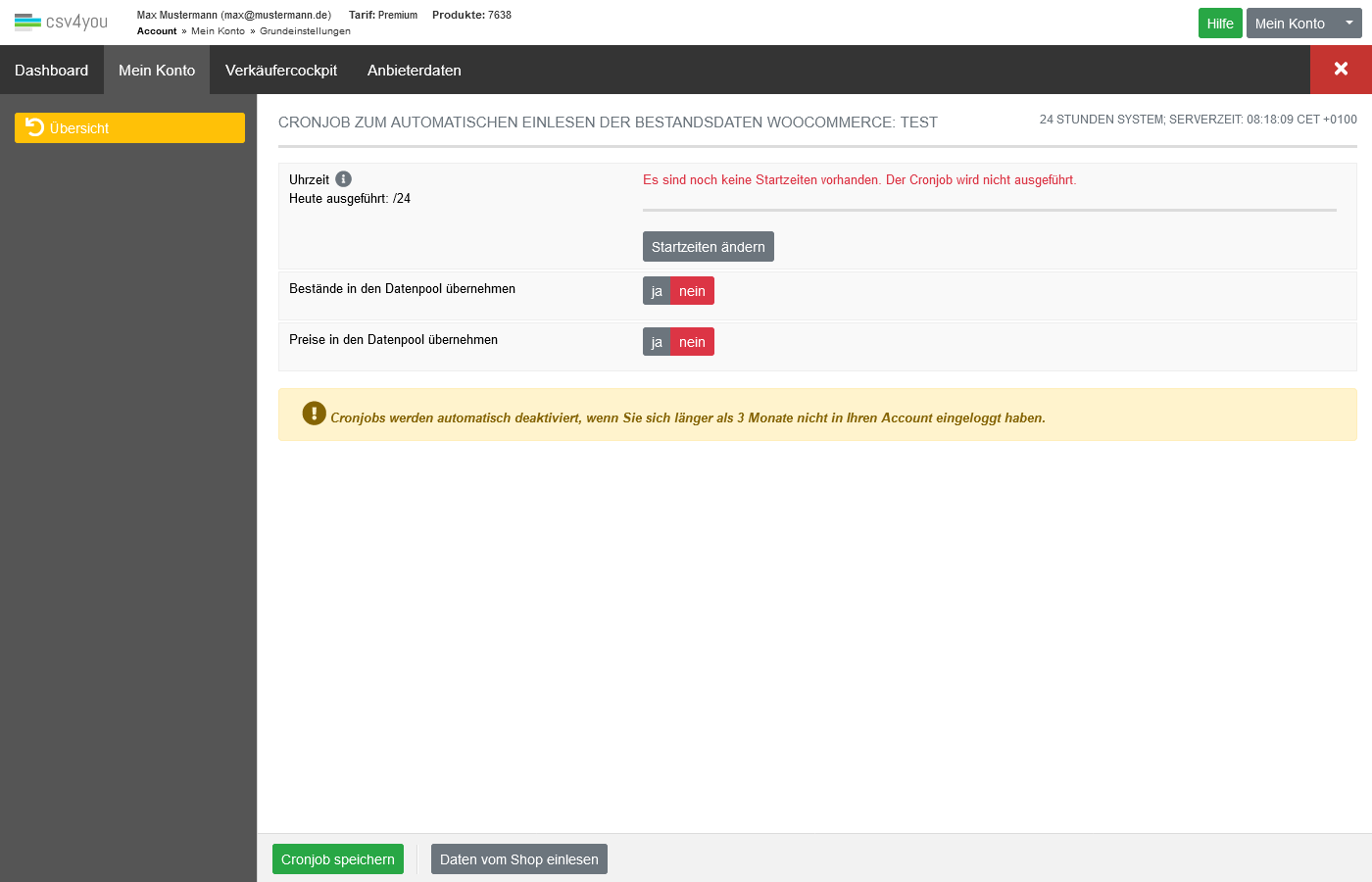Nach dem Export einer Produktneuanlage schauen Sie sich die Ihnen angebotenen Statusberichte an. In diesen finden Sie Informationen, ob die Produkte übertragen und angelegt wurden. Wenn das erledigt ist, sollten Sie Ihre aktuellen Shop-Daten in unser System zurücklesen. Das erfolgt im Bereich Listings und der Auswahl des jeweiligen Shops. Sie können dafür auch einen Cronjob benutzen, den Sie unter den jeweiligen Verbindungseinstellungen Ihres Systems mit CSV4YOU finden.