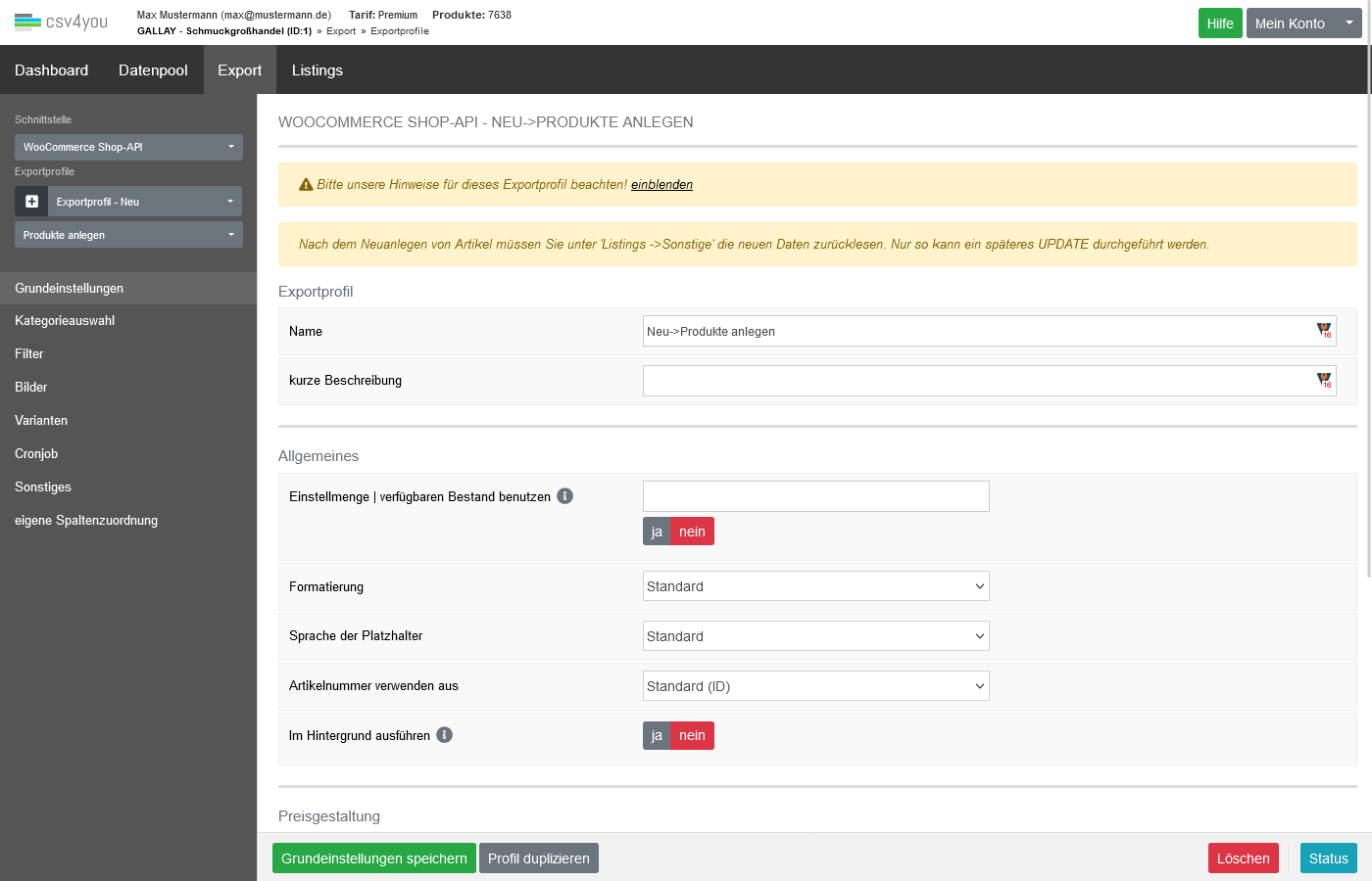 Exportprofil Neuanlage einrichten