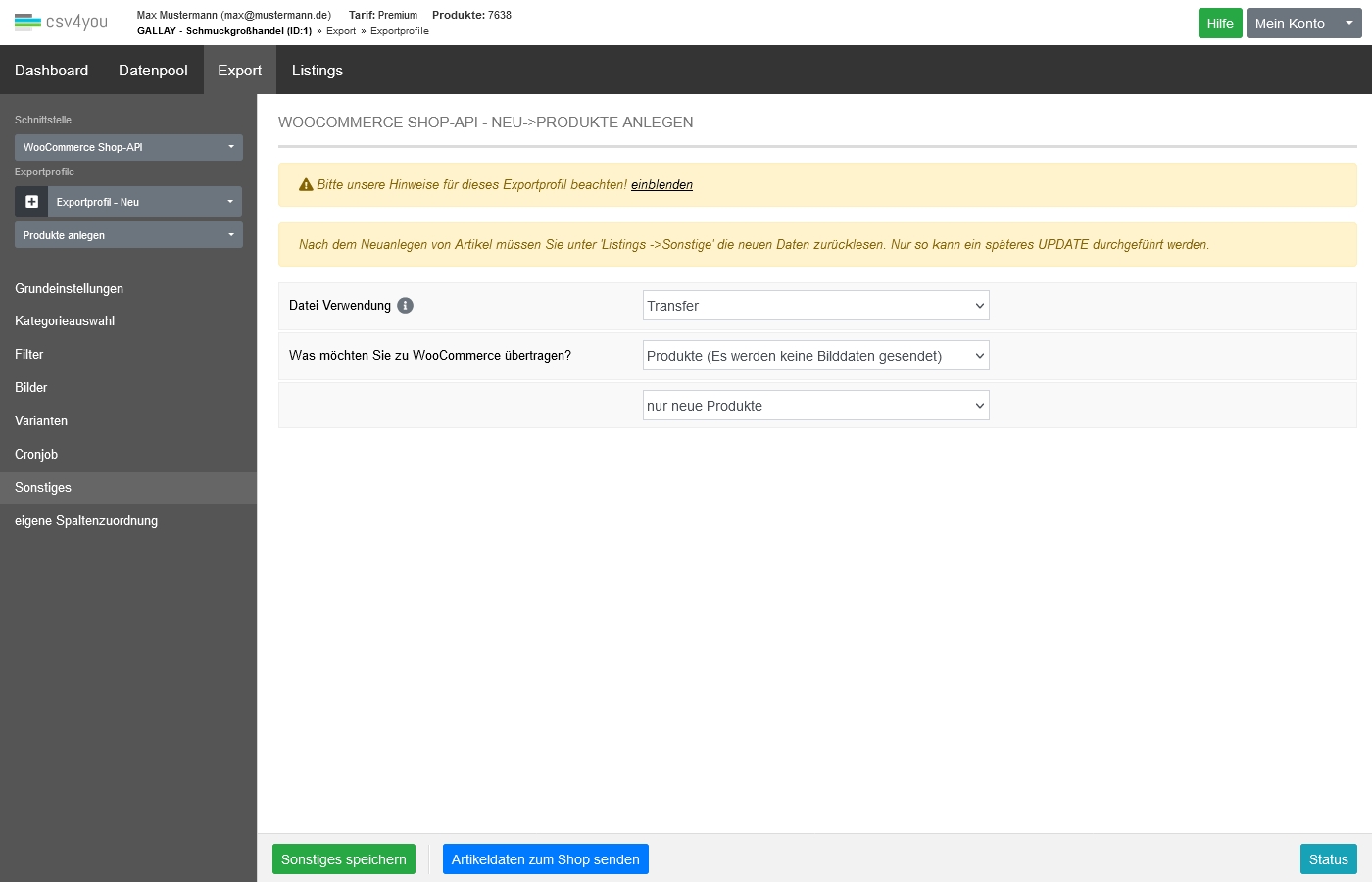 Richten Sie ein weiteres Exportprofil zum Bestandsabgleich mit folgenden Einstellungen ein: