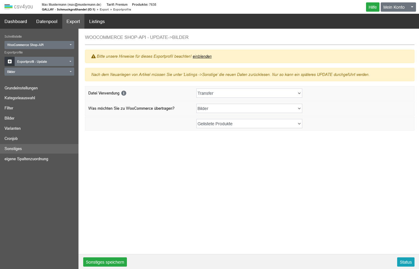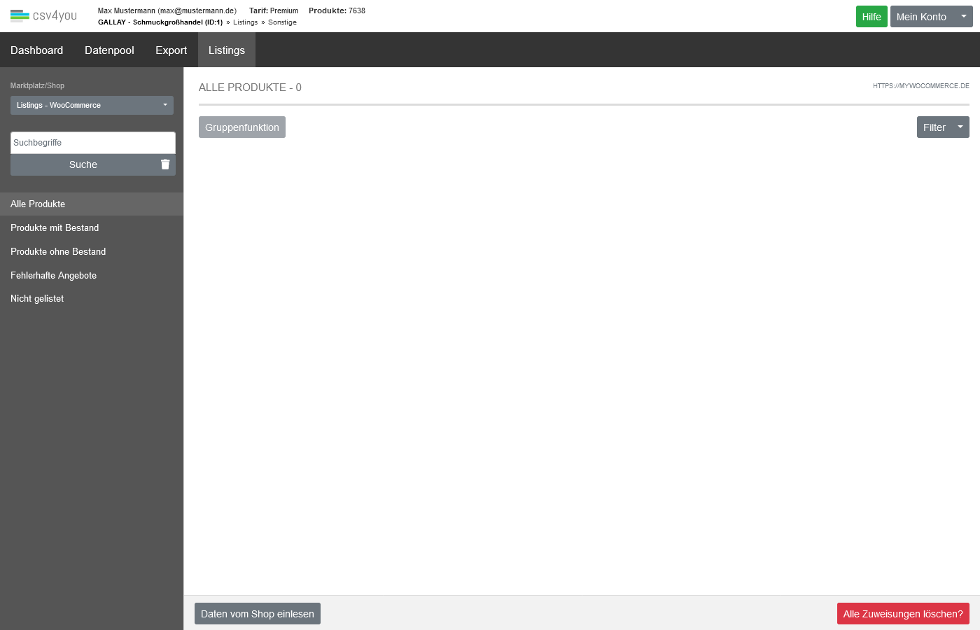Ein Zurücklesen auf der Seite 'Listings->Sonstige' mit dem Button 'Daten vom Shop einlesen' schreibt nur die Daten für die gerade benutzte Datenquelle. Es werden trotzdem im Hintergrund ALLE Listings von Ihrem WooCommerce-Shop zurückgegeben.