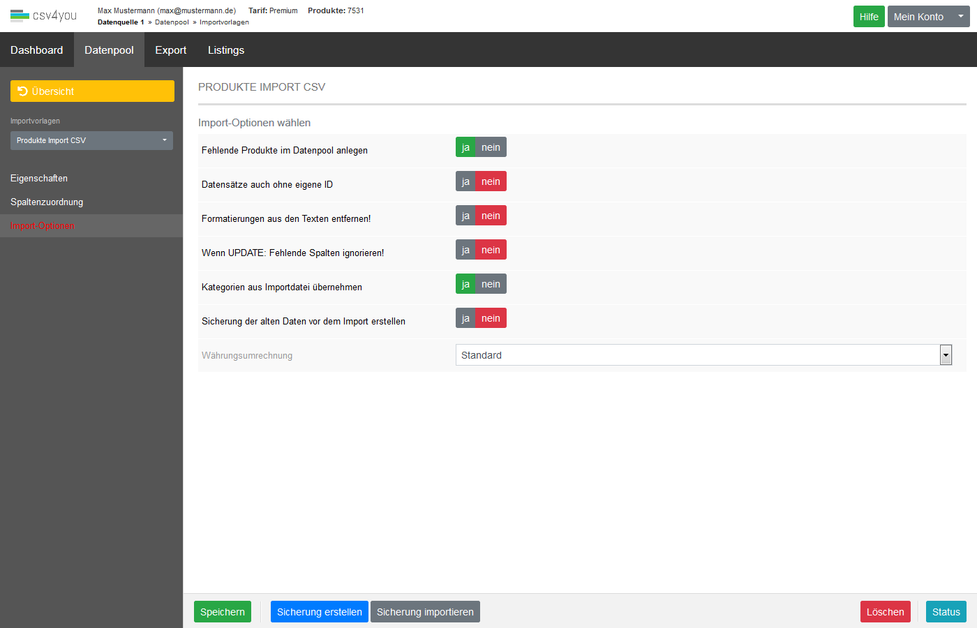 Machen Sie regelmäßig eine Datensicherung Ihrer Importvorlagen der aktiven Datenquelle. Sicherungsdateien werden bei uns im System gespeichert. Sie können diese zur Sicherheit auch downloaden und auf Ihrem Rechner speichern.
