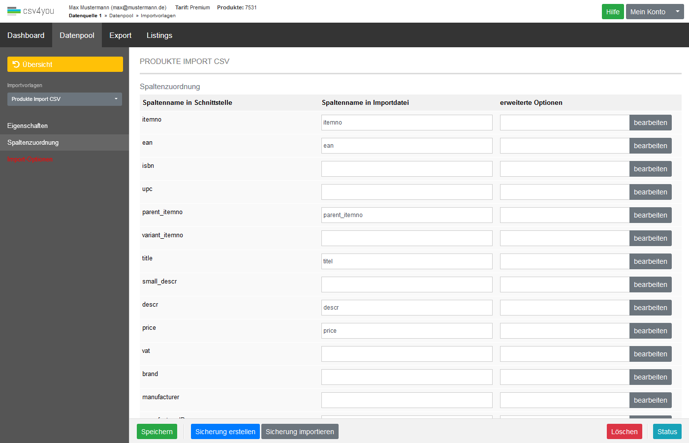 Die Bearbeitung in dieser Ansicht erfordert Kenntnisse im Umgang mit CSV4YOU. Wir empfehlen daher immer das Bearbeiten direkt beim Import durchzuführen. Die Spaltennamen stehen in Rohform in der Importvorlage.