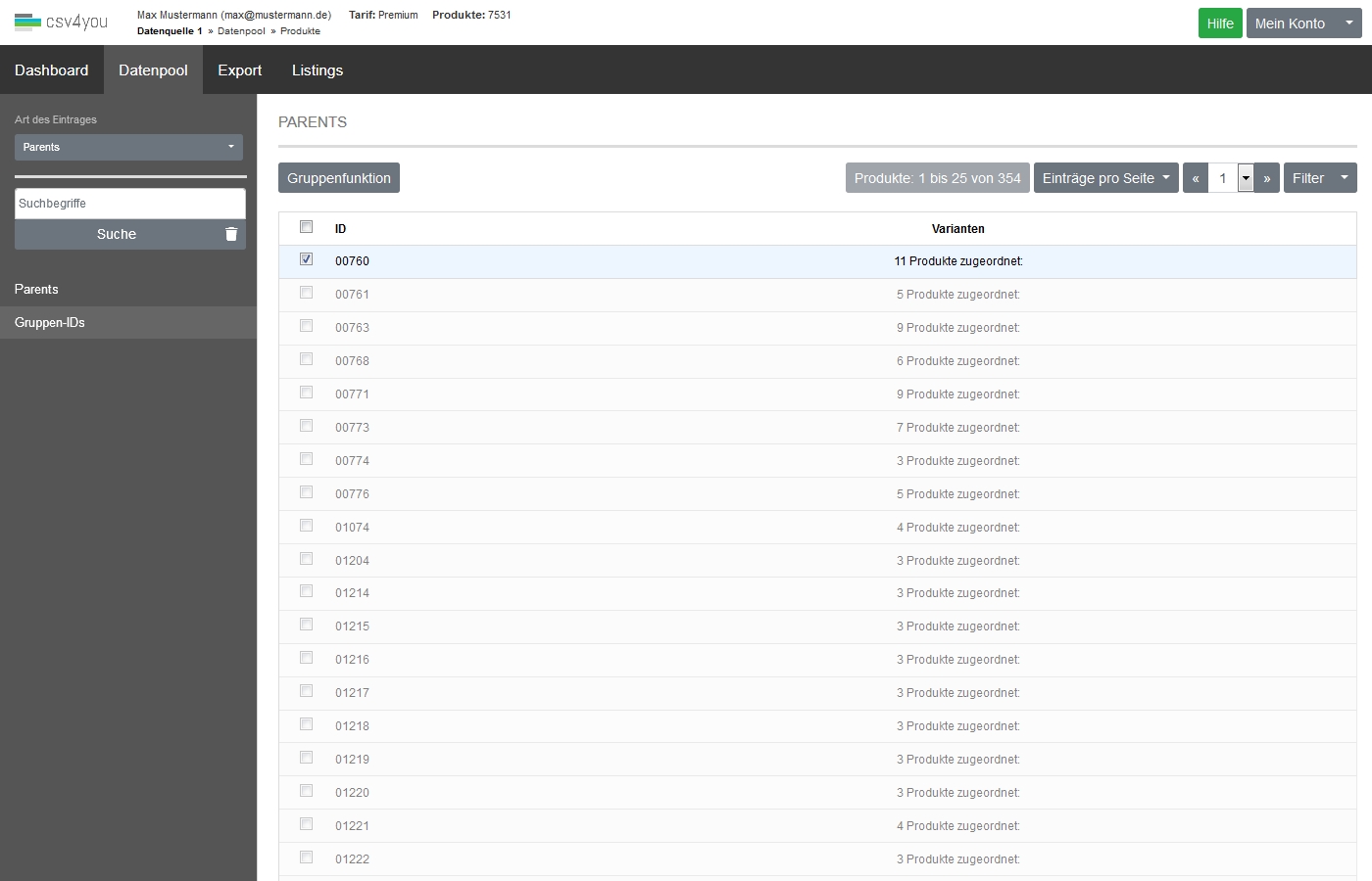 Beispiel 1 - Gruppen-IDs Parent: P12345 Variantenartikel: 12345-weiss, 12345-rot, 12345-schwarz, 12345-blau Es gibt einen Parent und 4 zugeordnete Varianten. Somit sind 5 Datensätze gespeichert. In den 4 Varianten steht im Feld