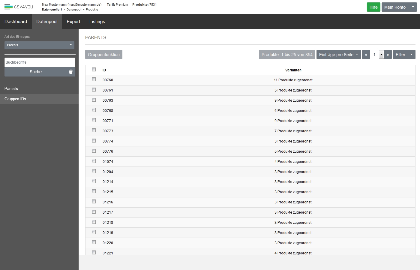Beispiel 2 - Importfile mit Gruppen-IDs Parents können auch automatisch über die Importfunktion im Datenpool angelegt werden. Dazu müssen im Importfile Parents vorhanden sein. Die Beschreibung von Parents sollte sich wenn möglich von den einzelnen Varianten unterscheiden.