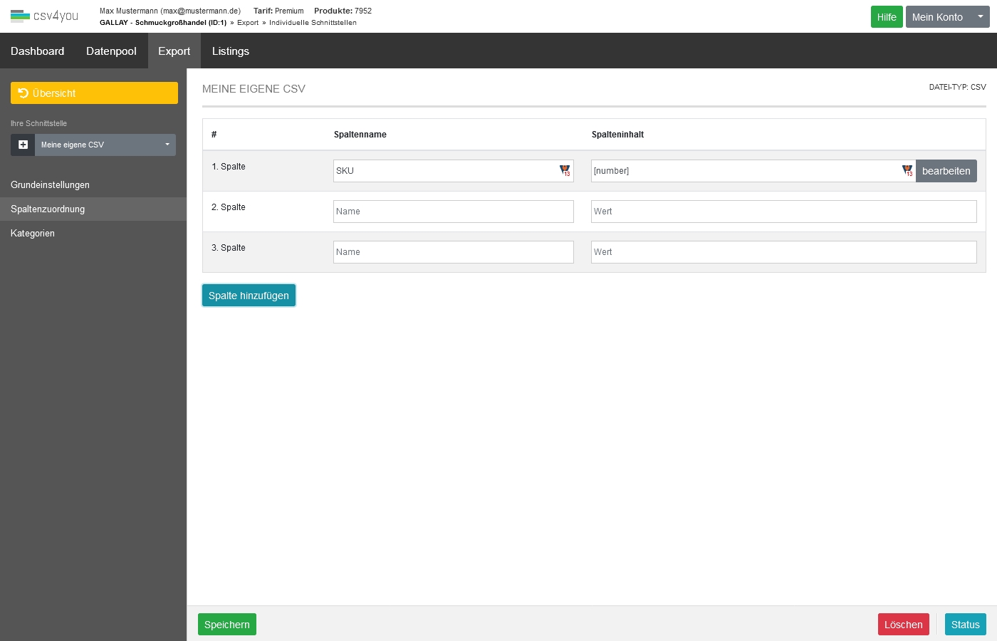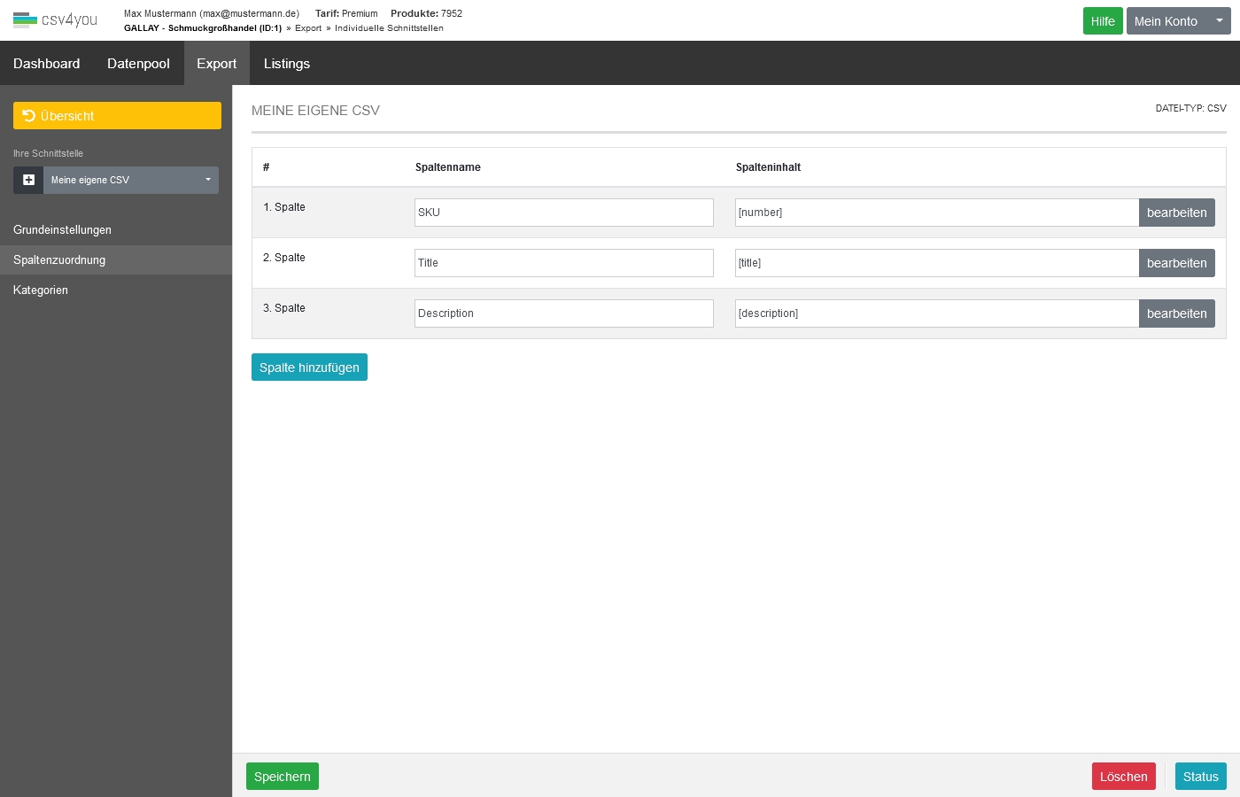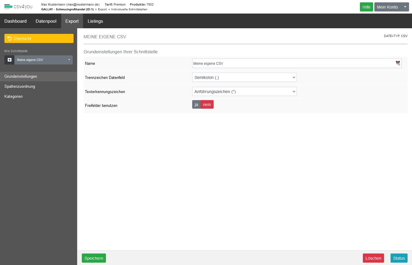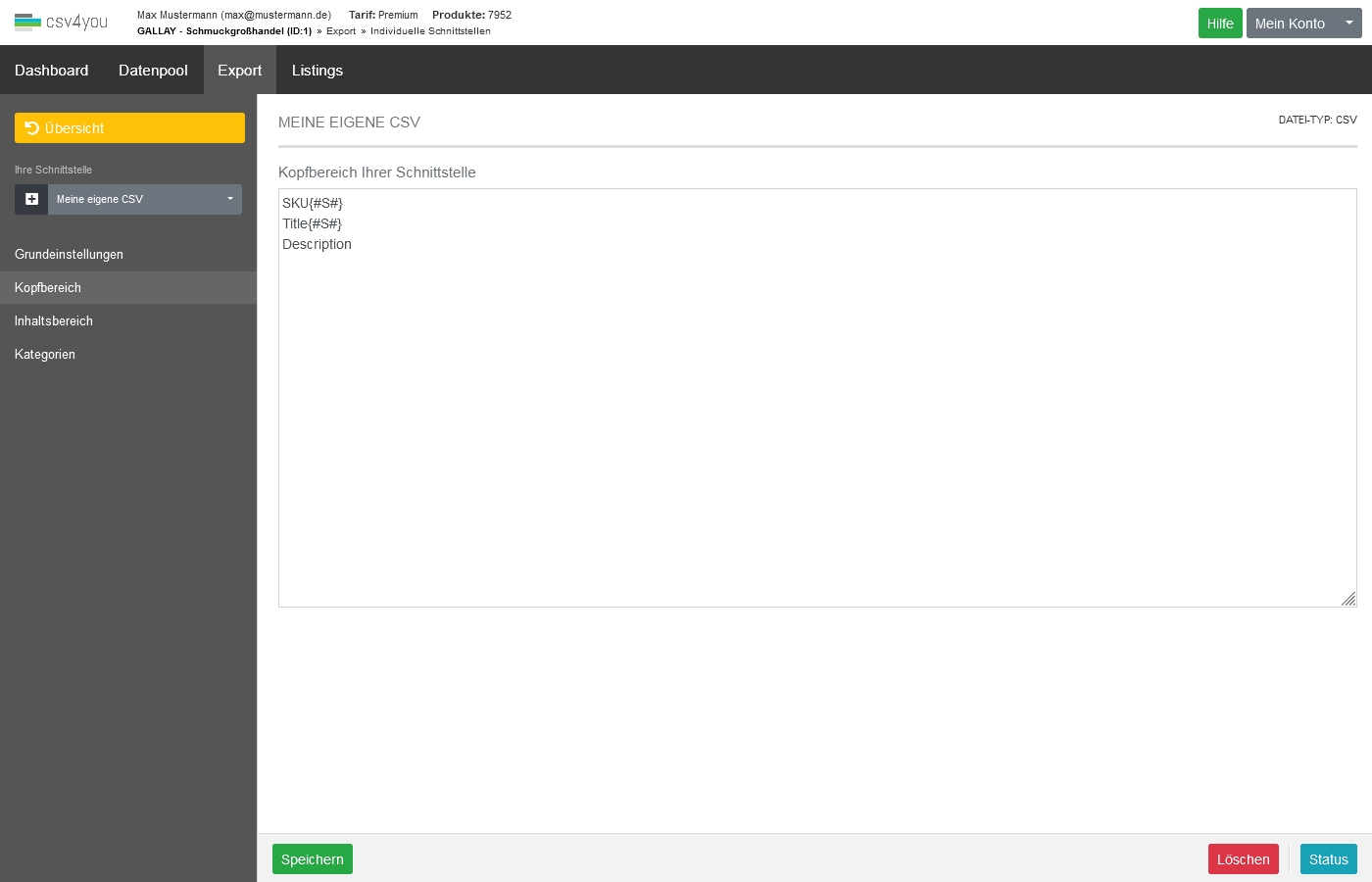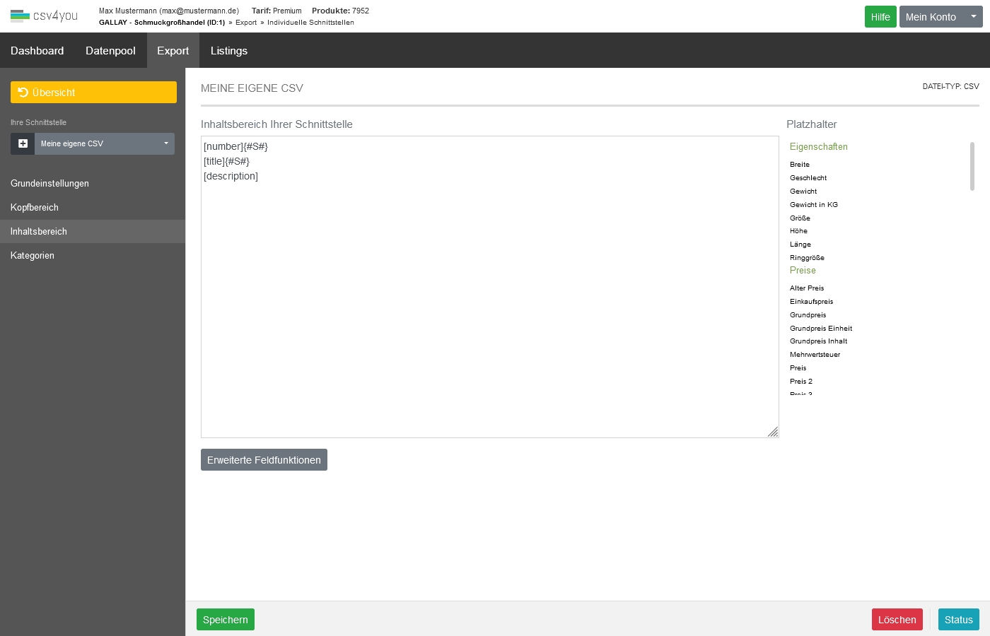Ein Beispiel für den Inhaltsbereich einer CSV-Schnittstelle: