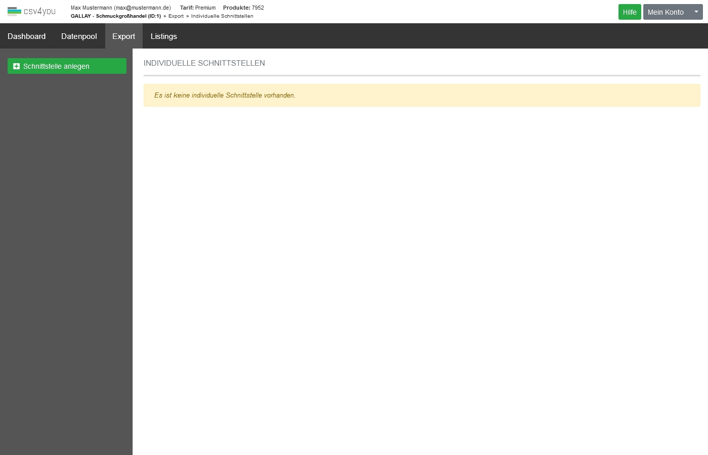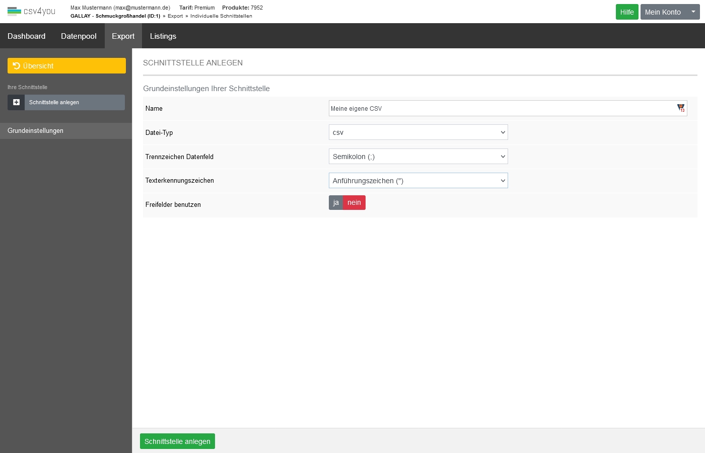 Im Bereich Individuelle Schnittstellen können Sie freie, individuelle CSV- oder XML-Formate definieren. Sie sehen dazu ein Auswahlmenü zum Anlegen bzw. zur Auswahl einer bereits von Ihnen vorbereiteten Schnittstelle. Die Anzahl individueller Schnittstellen ist nicht begrenzt.